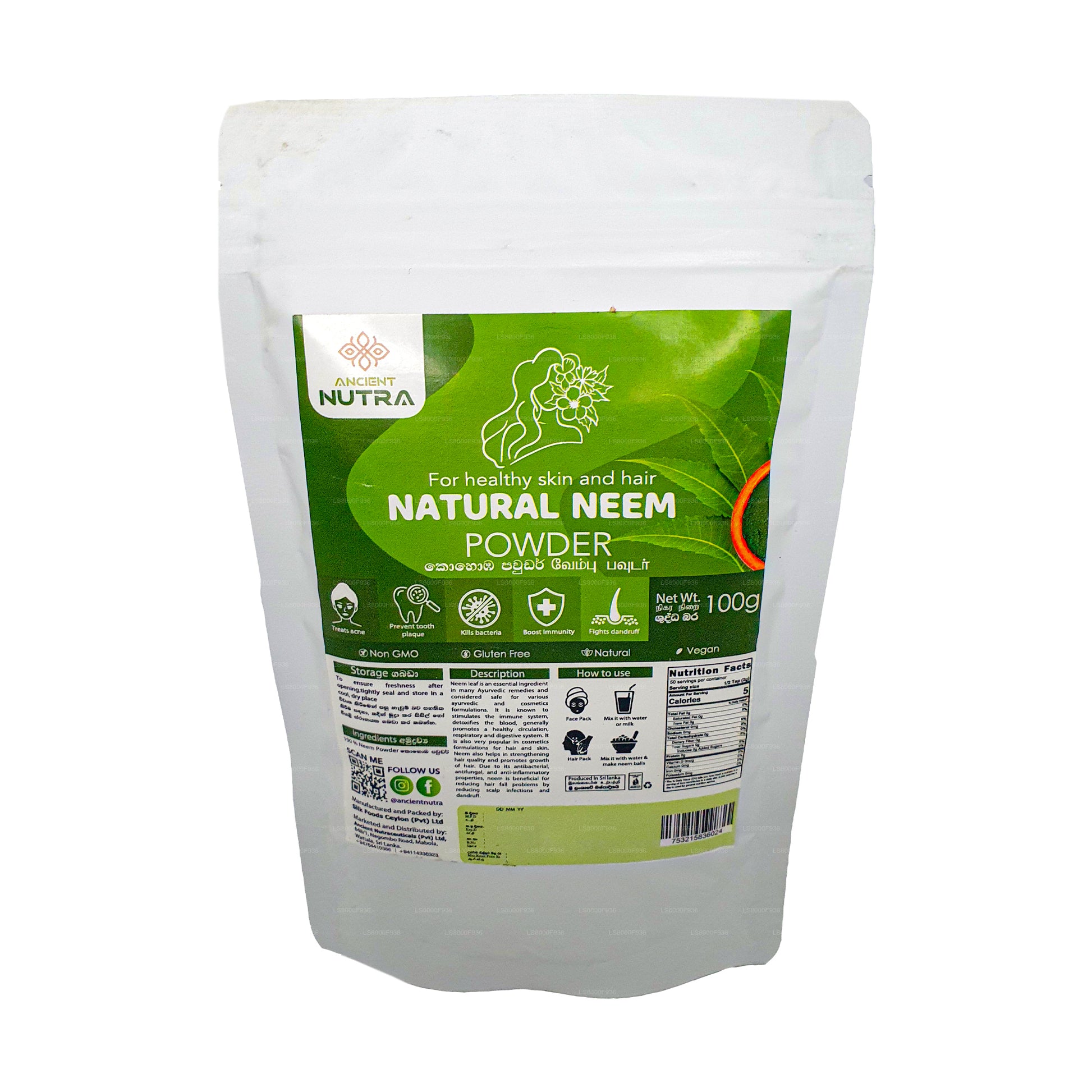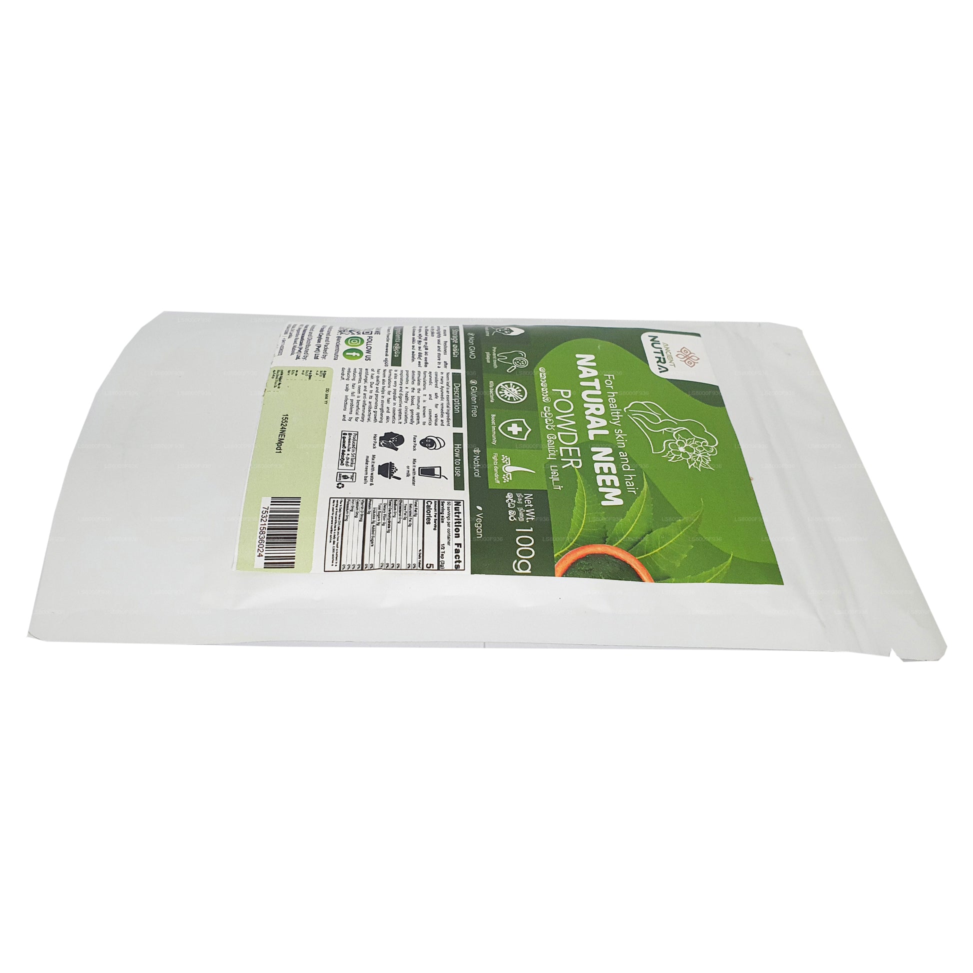 (SKU: LS8000F936) Discover the power of Ancient Nutra Neem Powder (100g). Derived from the revered neem tree, this premium powder encapsulates centuries of holistic wellness. Packed with natural nutrients and antioxidants, it offers a myriad of benefits for skin, hair, and overall health. With its finely ground consistency, the neem powder is versatile, allowing it to be effortlessly incorporated into skincare routines, hair treatments, and dietary supplements. Experience the time-honored secrets of Ayurveda in this convenient 100g pack, promoting vitality from the inside out. Embrace the goodness of neem, cherished through the ages, for a rejuvenated and nourished self.