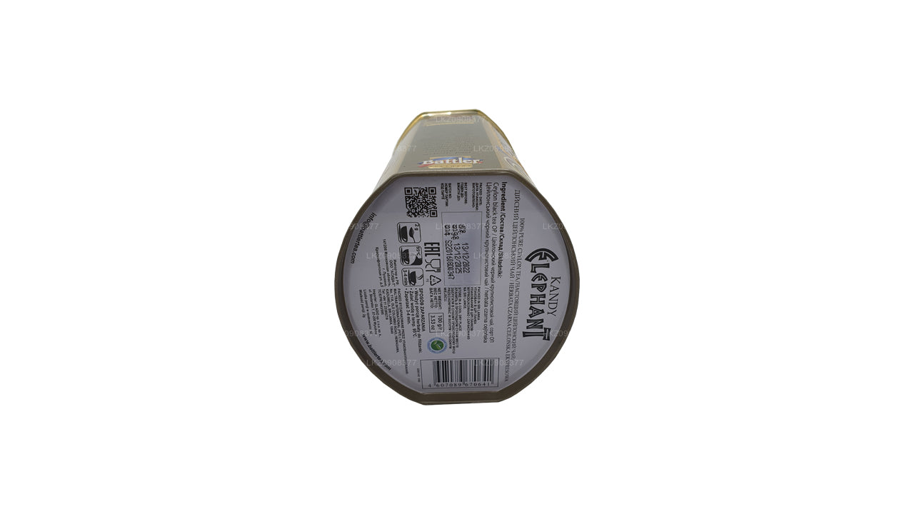 Battler Kandy Elephant OP is a whole leaf black tea from the central hills of Ceylon, designed to enchant your palate. This 100g caddy features low-grown, black rolled long whole leaves that produce a refreshing, pleasant aroma and a full-bodied, strong brew. The tea infuses into an orange color with a sweet, refreshing aroma, providing a robust and invigorating experience. Perfect for those who appreciate a deep and flavorful cup of tea from one of Ceylon's most celebrated tea-growing regions.