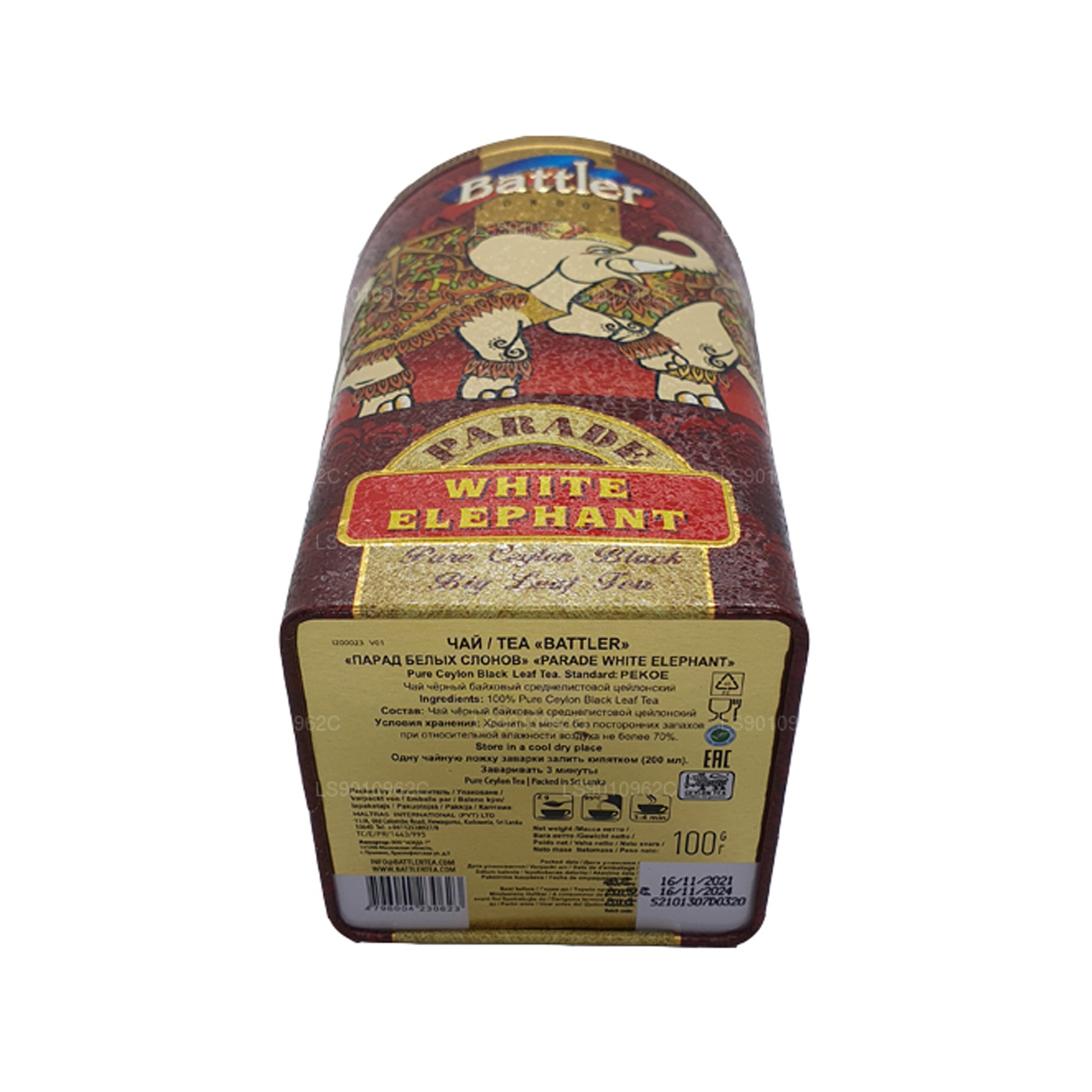 Battler Parade White Elephant is a premium Ceylon black tea crafted from carefully rolled PEKOE-grade whole leaves using the traditional orthodox method. This blend preserves the tea’s natural essence, offering a smooth, medium-bodied cup with a rich amber liquor and a soft, rounded character. Elegantly packed in a 100g tin caddy and sealed in an aluminum foil pouch, it ensures lasting freshness and refined quality, making it a perfect choice for tea connoisseurs. Made with 100% pure Ceylon black tea (PEKOE).