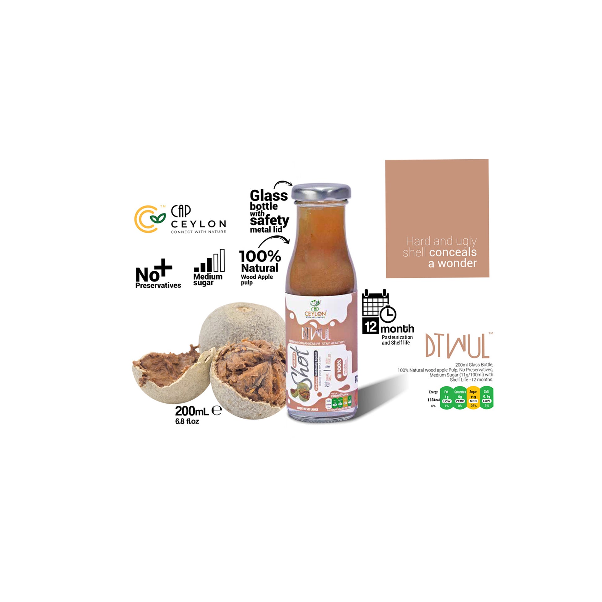 CAP Ceylon Wood Apple Shot (200 مل) هو مشروب استوائي صحي مصنوع من لب التفاح من الخشب الطبيعي بنسبة 100٪، ومعبأ بعناية في زجاجة زجاجية بغطاء معدني آمن. مع محتوى السكر المتوسط للحلاوة المتوازنة وعدم وجود مواد حافظة مضافة على الإطلاق، يتم تعقيم هذا المشروب المغذي لضمان فترة صلاحية تصل إلى 12 شهرًا مع الحفاظ على نكهته الأصلية. يوفر CAP Ceylon Wood Apple Shot الغني بالفوائد الطبيعية طعمًا منعشًا فريدًا ودعمًا منعشًا، مما يجعله خيارًا مثاليًا للأفراد المهتمين بالصحة الذين يبحثون عن النكهة والعافية