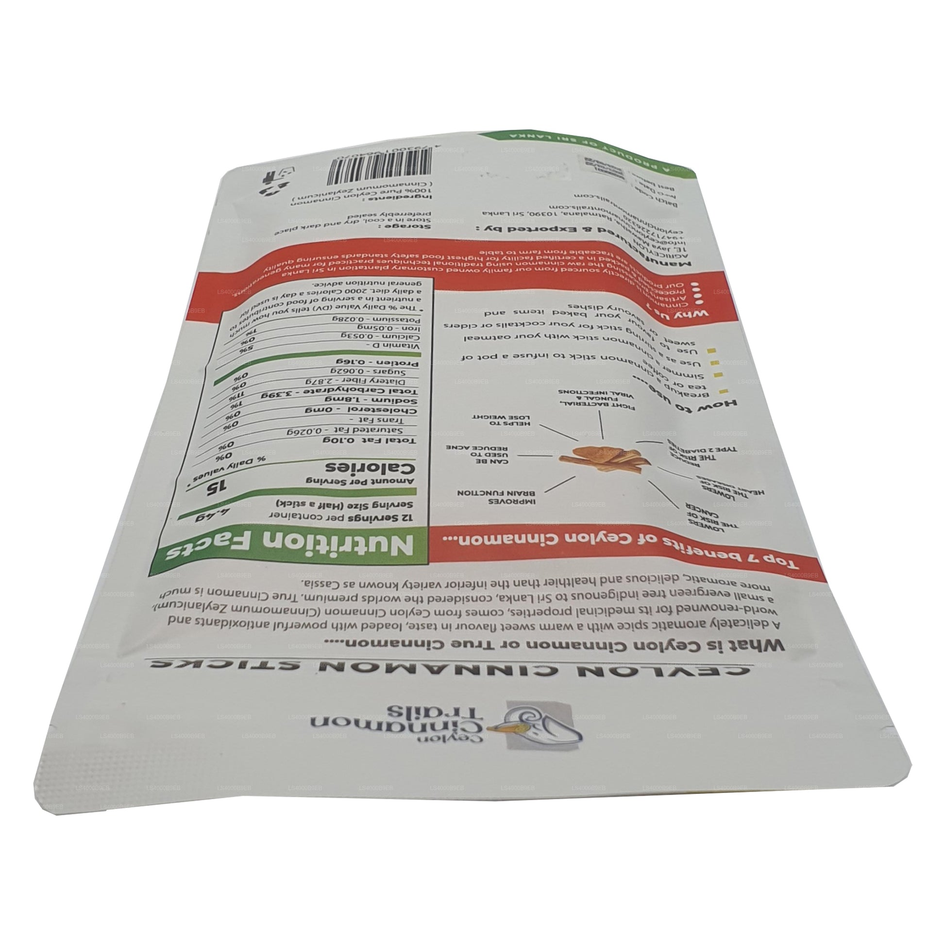 (SKU: LS4000B9EB) Ceylon Cinnamon Trails Cinnamon Sticks (50g) offer the aromatic charm of Ceylon cinnamon, celebrated for its subtle and sweet flavor. In a convenient 50-gram package, these cinnamon sticks are versatile in both home and professional kitchens. With a well-rounded flavor profile, they add warmth to both sweet and savory dishes. Sourced from Sri Lanka, the sticks deliver a taste of culinary excellence and are known for their potential health benefits. An essential spice for flavor enthusiasts and those seeking the best in their dishes.