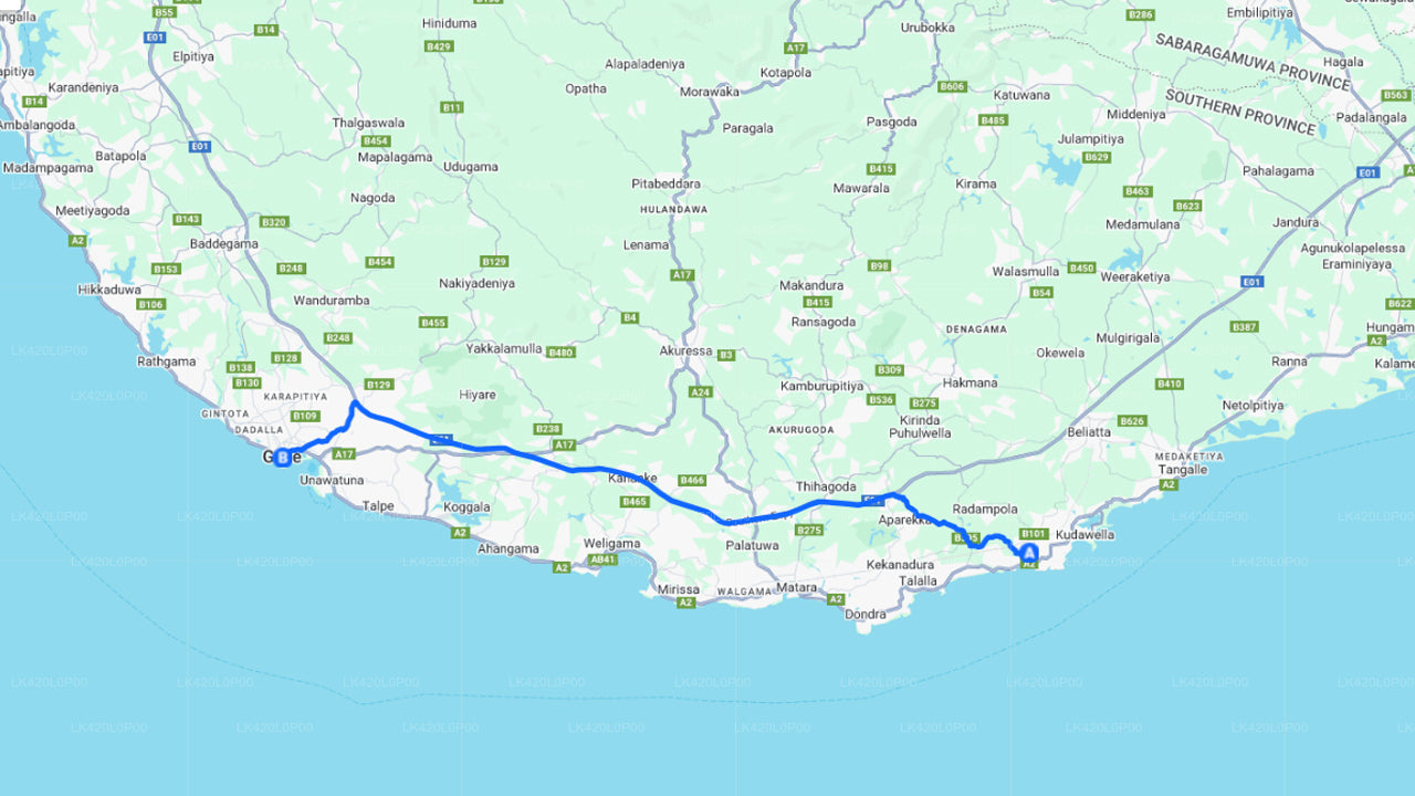 - Pick-up within the city limits of Dikwella and drop-off within the city limits of Galle.