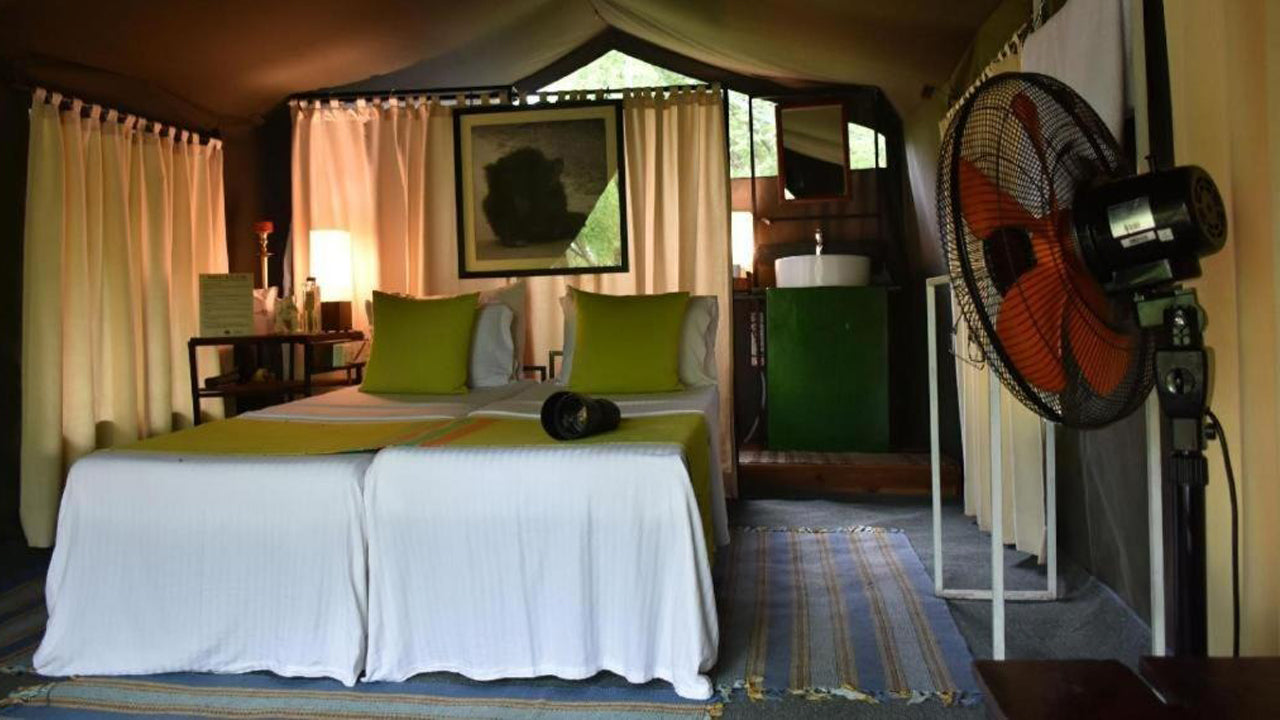 The property features well-designed tented lodgings that combine simplicity with comfort. Each tent includes soft bedding, private washroom facilities, and an outdoor seating area, allowing guests to enjoy the soothing atmosphere of the hill country.