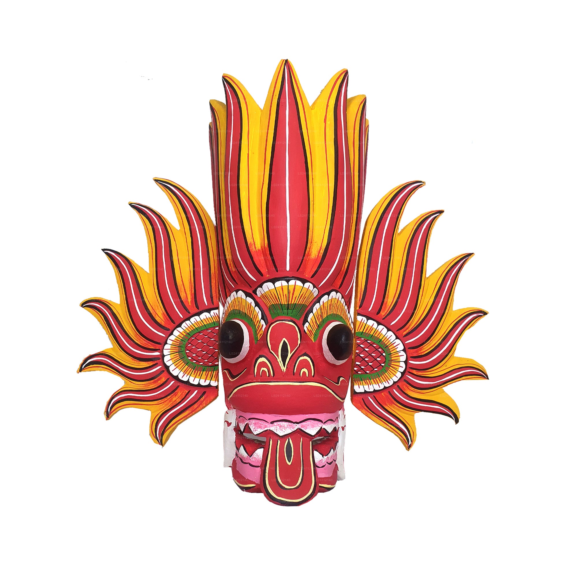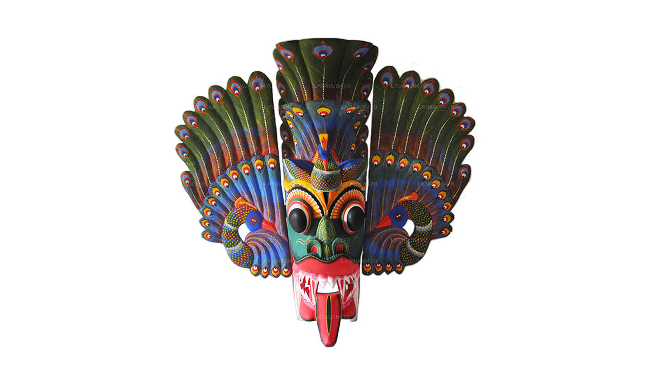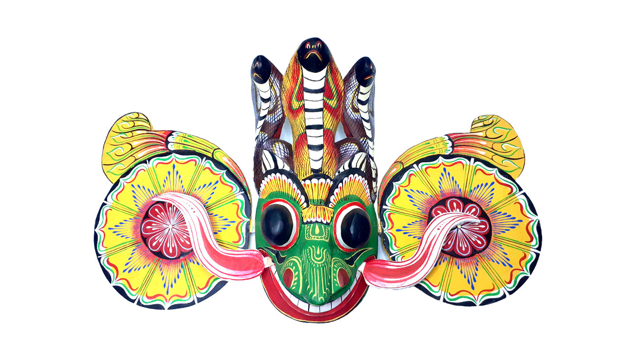 These Raksha masks are also the final aspect of the Kolam Ritual and they are used as a form of tribute to the Rakshasas, a race that once ruled ancient Sri Lanka. It is also believed that the possession of these masks will attract good fortune while warding off the bad. The masks are made of kaduru wood while the paint is acrylic.