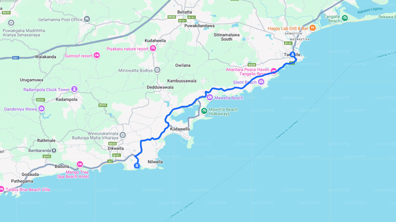 - Pick-up within the city limits of Tangalle and drop-off within the city limits of Hiriketiya.